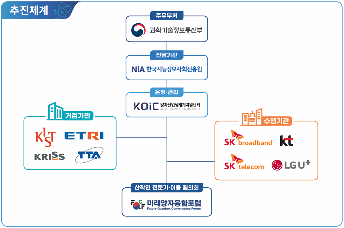 개방형 양자 테스트베드 구축·운영을 위한 과학기술정보통신부 아래 전담기관, 거점기관, 수행기관 및 이용 협의회로 추진체계 구성